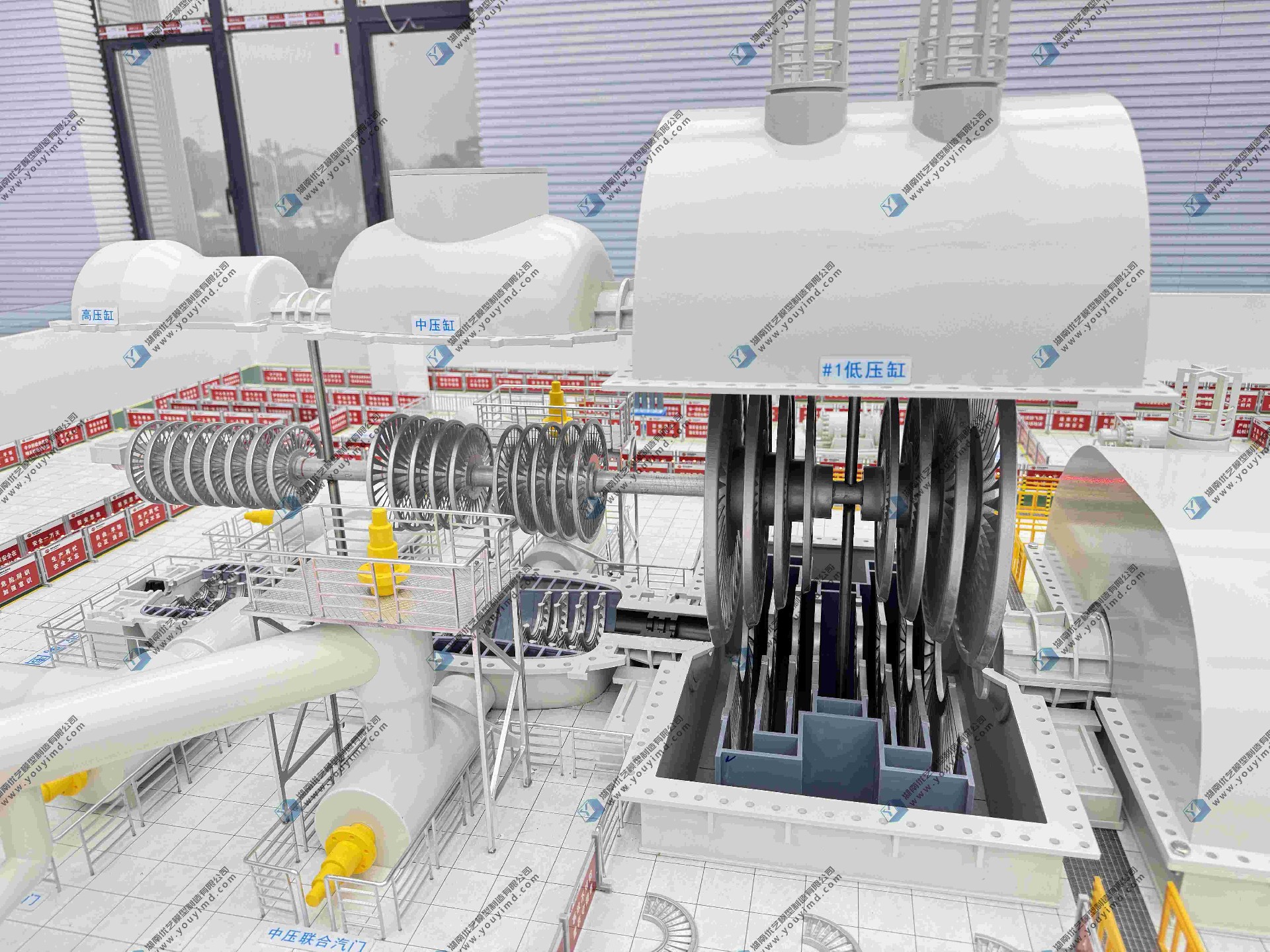 核心設備區:集中排布汽輪機、發電機、給煤機、主變壓器等核心裝置,設備按廠區真實空間關系等比例縮放。其中汽輪機區域的轉子、汽缸等部件結構完全外露,