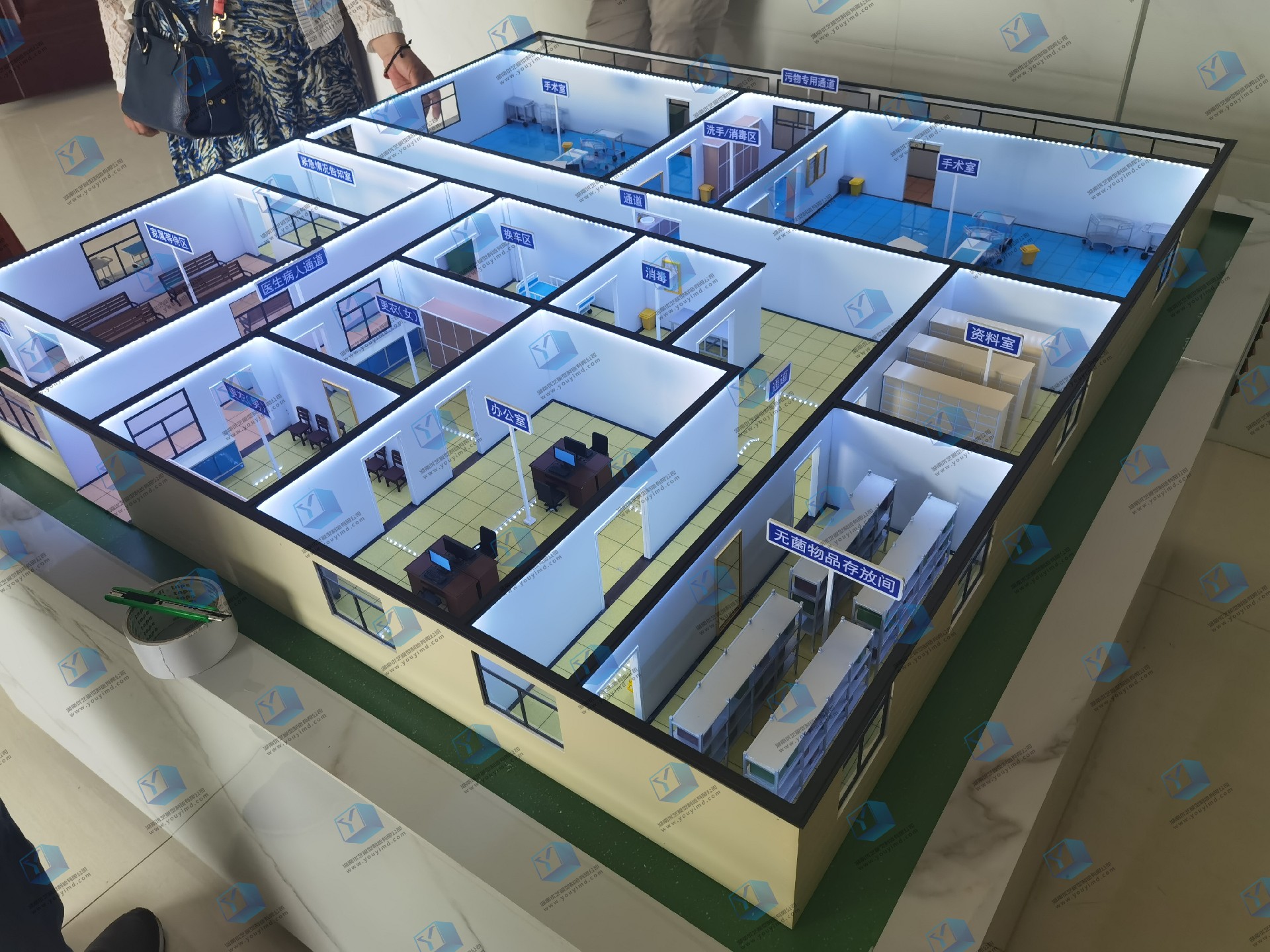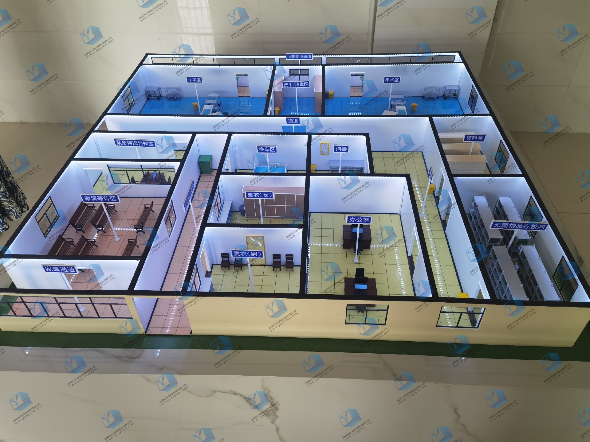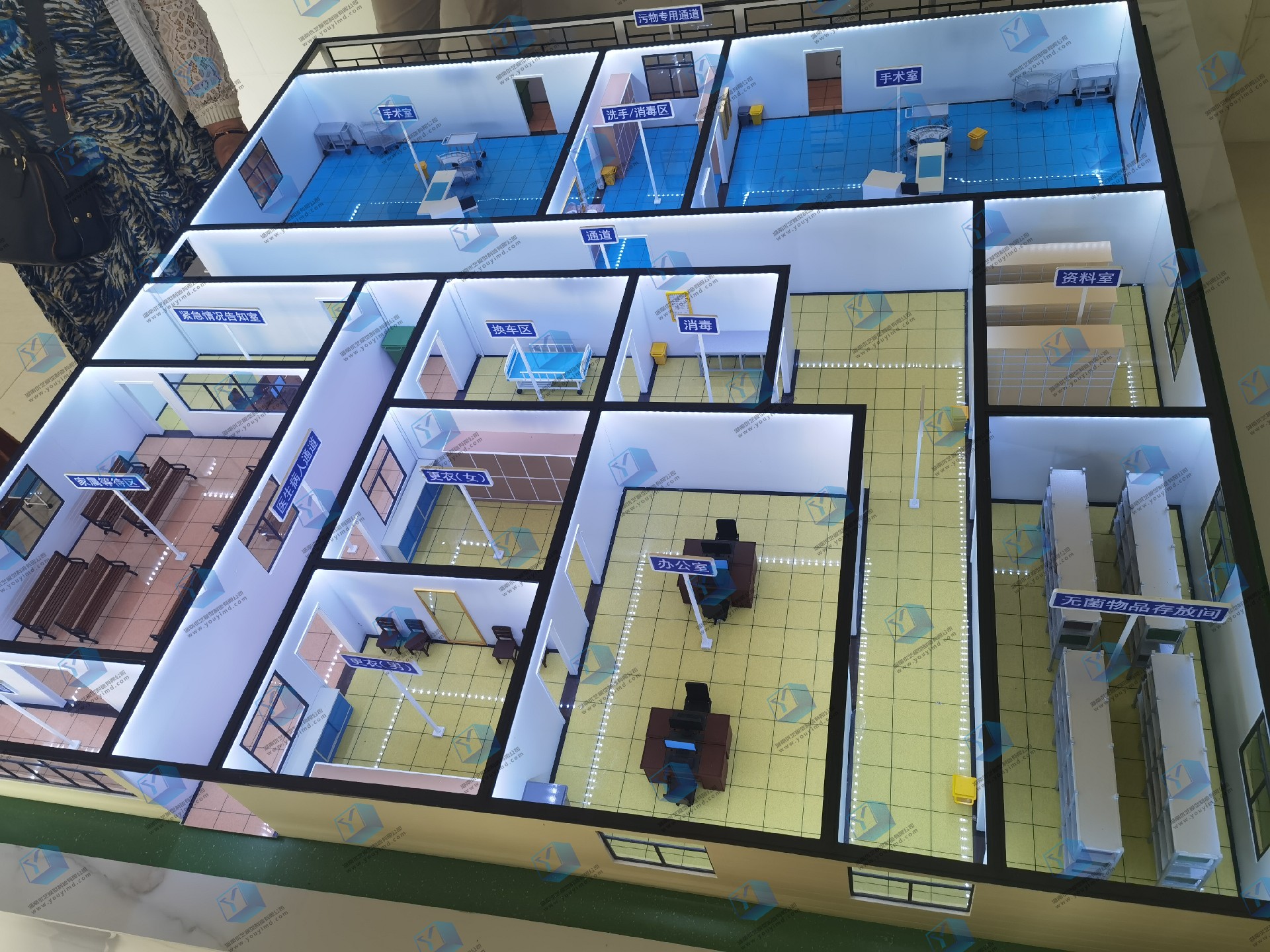 手術室工作流程沙盤模型根據典型醫院手術樓層布局設計制作, 主要包含手術準備區、 手術操作區(兩間手術室)、 醫生辦公區等區域,每個區域內底板顏色分色區分, 每個區域內制作出對應的設備模型, 每個區域內的單獨功能模塊采用單獨燈光控制, 方便老師與學生在沙盤上扮演角色, 進行工作流程演示, 如醫生角色進入更衣室到手術室工作流程沙盤上可以單獨控制每個經過的工作區域燈光被單獨點亮, 便于老師講解每個區域的知識點, 學生可直觀的看到所講的功能區域內的設備布局與工作流程。