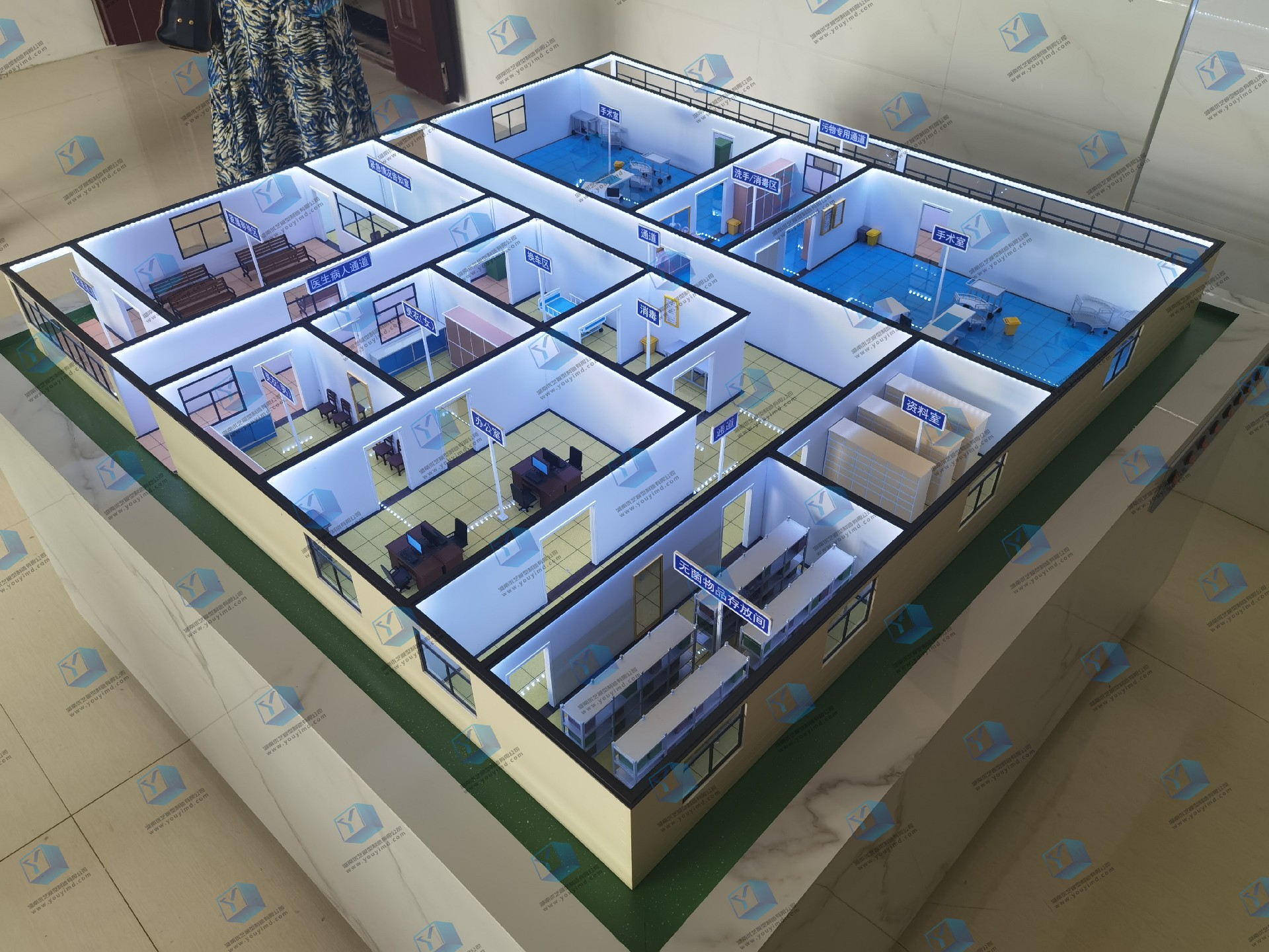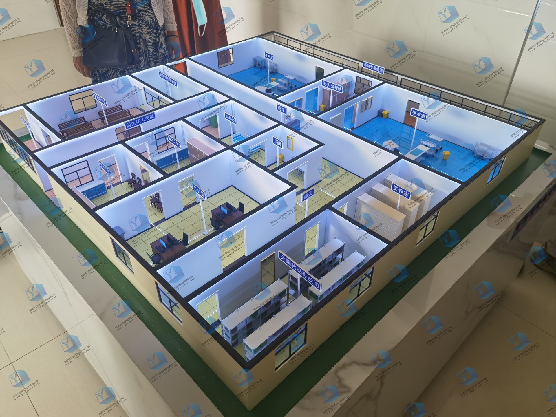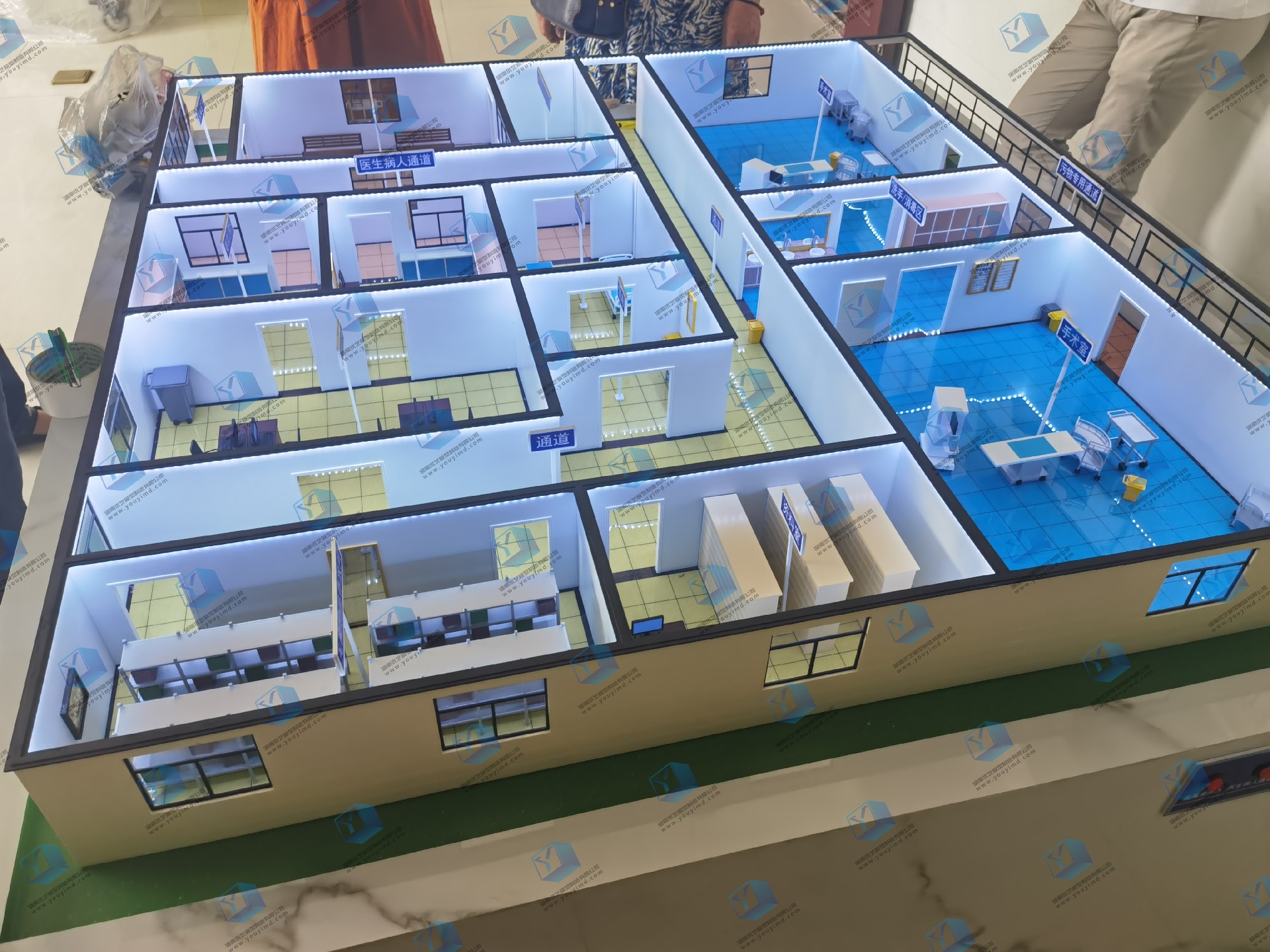 手術室工作流程沙盤模型根據典型醫院手術樓層布局設計制作, 主要包含手術準備區、 手術操作區(兩間手術室)、 醫生辦公區等區域,每個區域內底板顏色分色區分, 每個區域內制作出對應的設備模型, 每個區域內的單獨功能模塊采用單獨燈光控制, 方便老師與學生在沙盤上扮演角色, 進行工作流程演示, 如醫生角色進入更衣室到手術室工作流程沙盤上可以單獨控制每個經過的工作區域燈光被單獨點亮, 便于老師講解每個區域的知識點, 學生可直觀的看到所講的功能區域內的設備布局與工作流程。