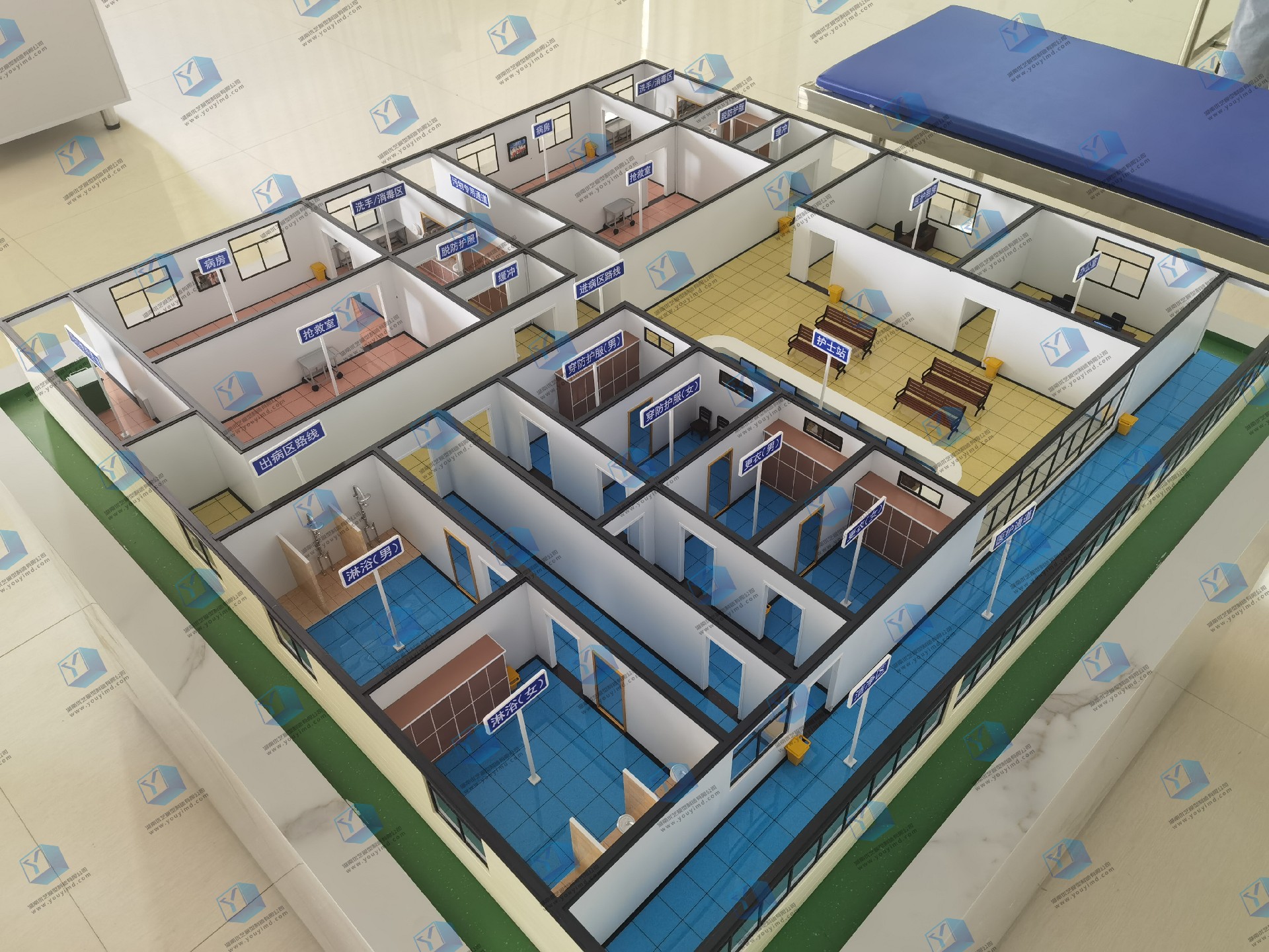 醫院感染科工作流程沙盤模型根據典型醫院感染科樓層布局設計制作, 主要包含病房、 醫生通道, 清潔區, 半污染區, 污染區, 污物通道(患者通道), 每個區域內制作出對應的設備模型, 每個區域內的單獨功能模塊采用單獨燈光控制共約 12 套燈光控制,方便老師與學生在沙盤上扮演角色, 進行工作流程演示, 如醫生角色工作流程沙盤上可以單獨控制每個經過的工作區域燈光被單獨點亮, 便于老師講解每個區域的知識點, 學生可直觀的看到所講的功能區域內的設備布局與工作流程。