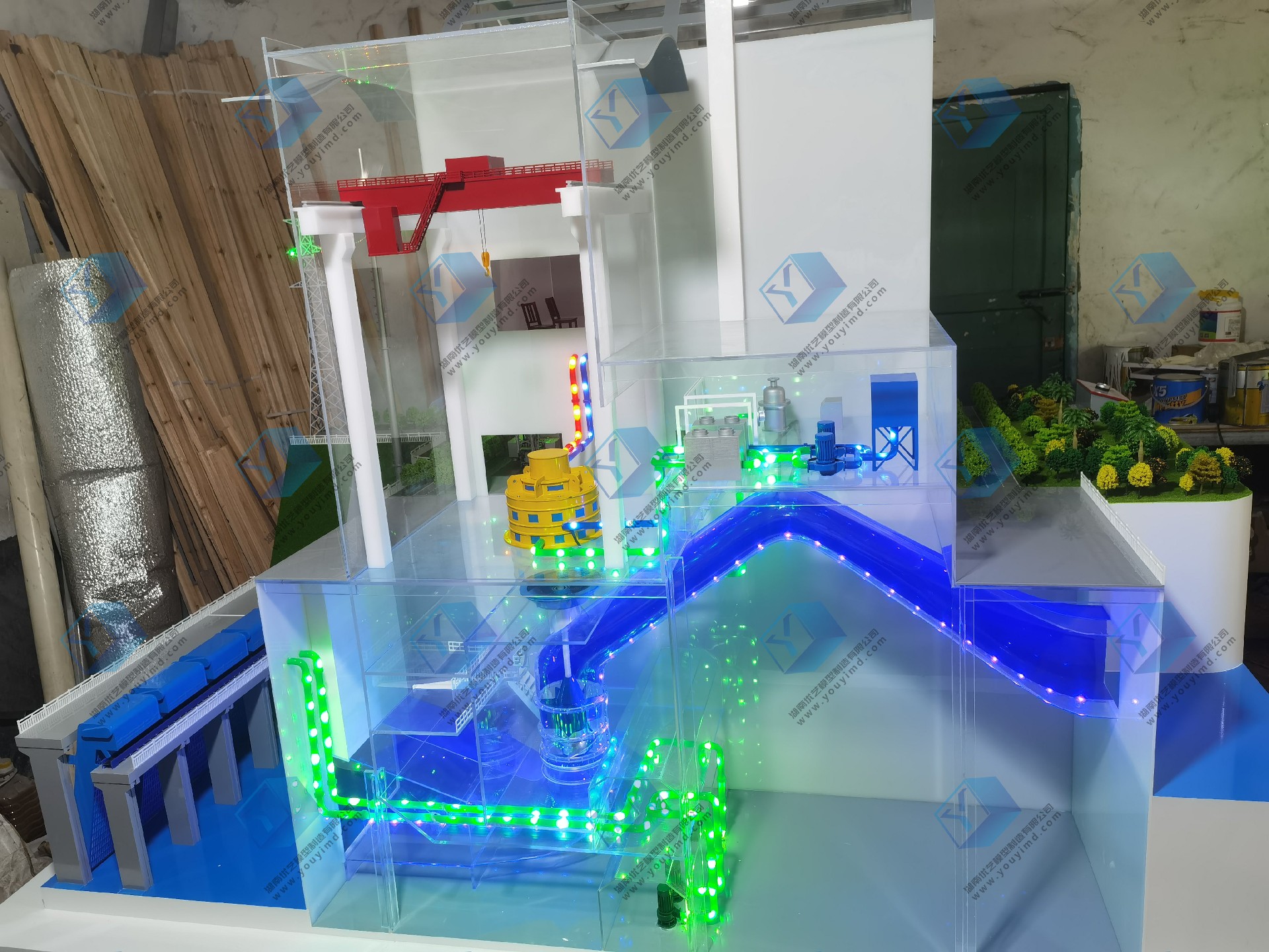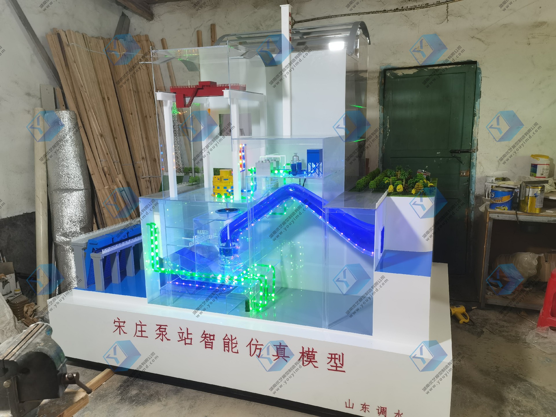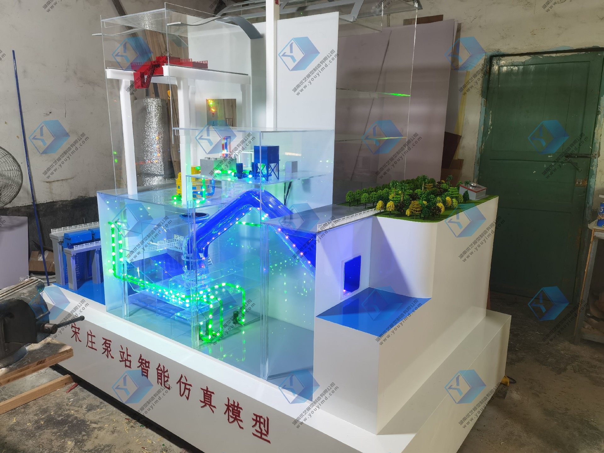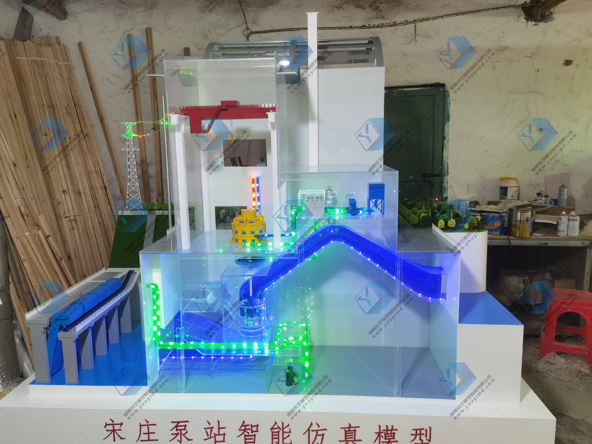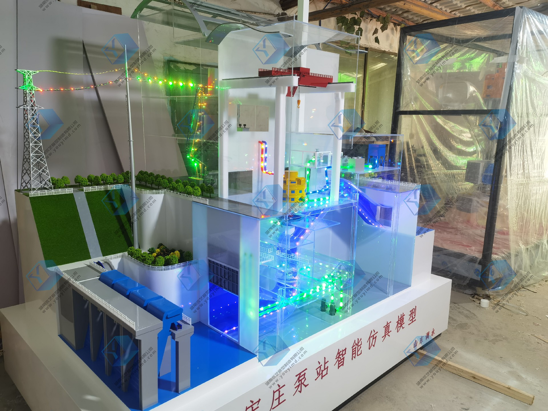泵站仿真模型是湖南省優藝模型與山東省調水工程運行維護中心壽光管理站,共同研發仿真設備,設備整體尺寸為:長2.4米,寬1.5米,整體以剖面結構,內部透明結構展示,電動動態演示,采用不同顏色亞克力管道制作出:機組排水管道、機組冷卻管道、機組潤滑管道、電力輸送,水流流向等,管道內過LED流水燈,動態模擬各種介質流向,整體結構嚴謹正確,比例協調美觀,適用于各種場合的教學、培訓、展覽、科普